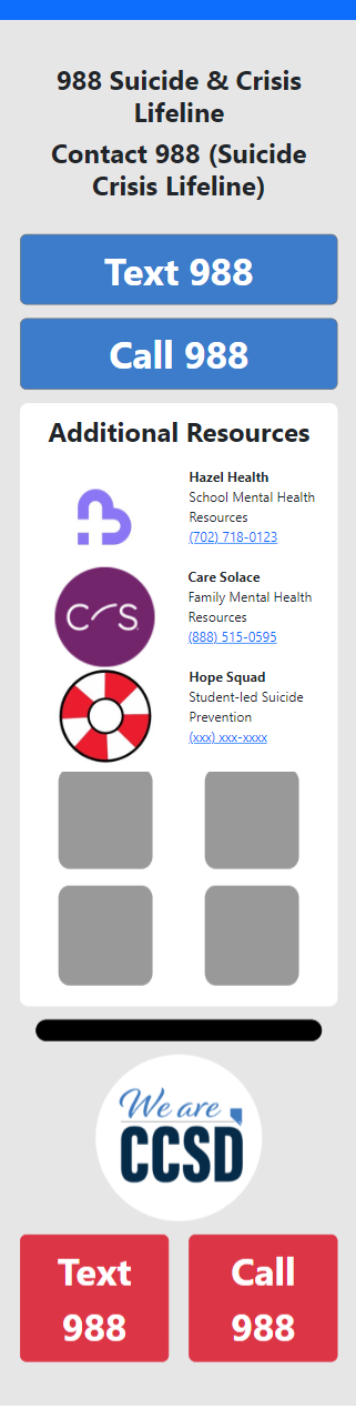 I designed and developed a mobile-first website for the Clark County School District focused on providing students, families, and staff with easy access to mental health resources and crisis support services. The project prioritized accessibility, clear information architecture, and responsive performance to ensure users could quickly find critical support resources on any device. The interface was optimized for mobile usage—where most users access district resources—while maintaining full responsiveness across desktop and tablet. The result was a streamlined, user-centered platform that improves visibility of counseling services, crisis contacts, and community support programs available to the district’s 300,000+ students and their families.